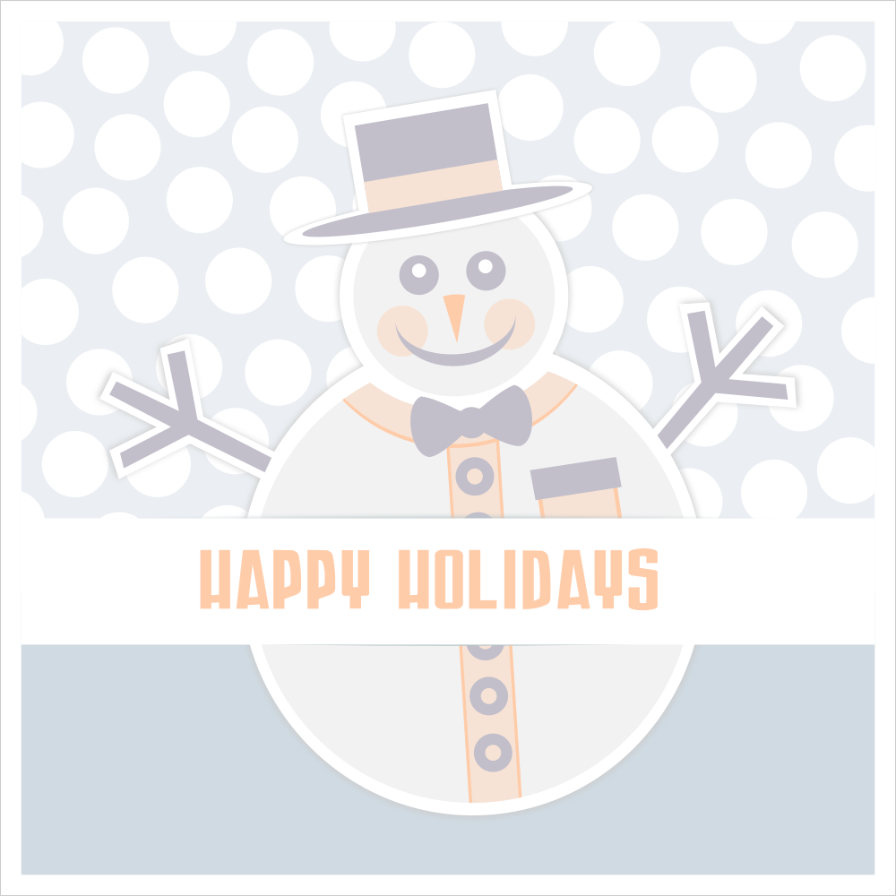This features a large, happy snowman wearing a hat, scarf, and bowtie. He is standing in front of a background with polka dots, giving the scene a festive appearance. The snowman appears to be smiling as he poses for the picture. In addition to the main snowman, there are smaller snowmen scattered throughout the image, adding more charm to the overall design. The text "Happy Holidays" is written in the bottom left corner of the card, further emphasizing the festive theme.