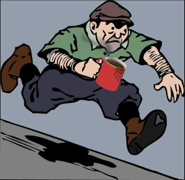 This features a man in a green shirt and hat, running with a red coffee cup in his hand. He appears to be in motion, possibly trying to catch up or rush somewhere. The man's facial expression suggests that he is focused on reaching his destination quickly. The scene captures the essence of a busy day where people are constantly on the move and multitasking with their daily routines.