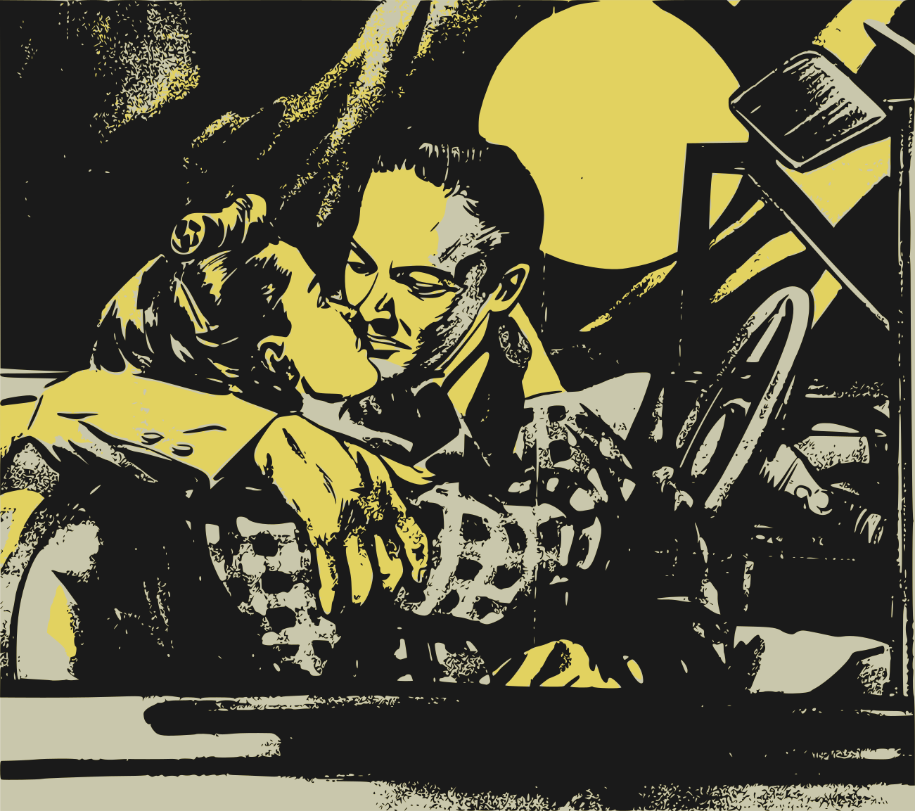This is a black and white drawing of a man and woman kissing. They are both embraced, with the woman on top of the man. The scene takes place in an old-fashioned setting, possibly a vintage poster or advertisement. In addition to the couple, there are several other elements present in the image. A car is visible in the background, and a clock can be seen hanging on the wall. There's also a chair located near the bottom of the scene. The overall atmosphere suggests a romantic moment between the two individuals.