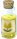 This features a small yellow bottle with a white cap, sitting on top of a table. The bottle is filled with a yellow liquid and has a flower design on the front. Next to the bottle, there is another smaller bottle that appears to be empty. The scene also includes a cup placed near the edge of the table. This image may have been taken in a kitchen or dining area where various items are commonly found.