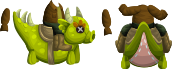 This features a series of four different cartoon-like dragon toys. Each dragon has a unique design, with one being green and yellow in color. They are all sitting on top of a wooden surface, possibly a table or shelf. The dragons appear to be made from various materials such as wood, plastic, or other crafting materials. These toys may have been created for children's entertainment or as decorative items for a room with a fantasy theme.