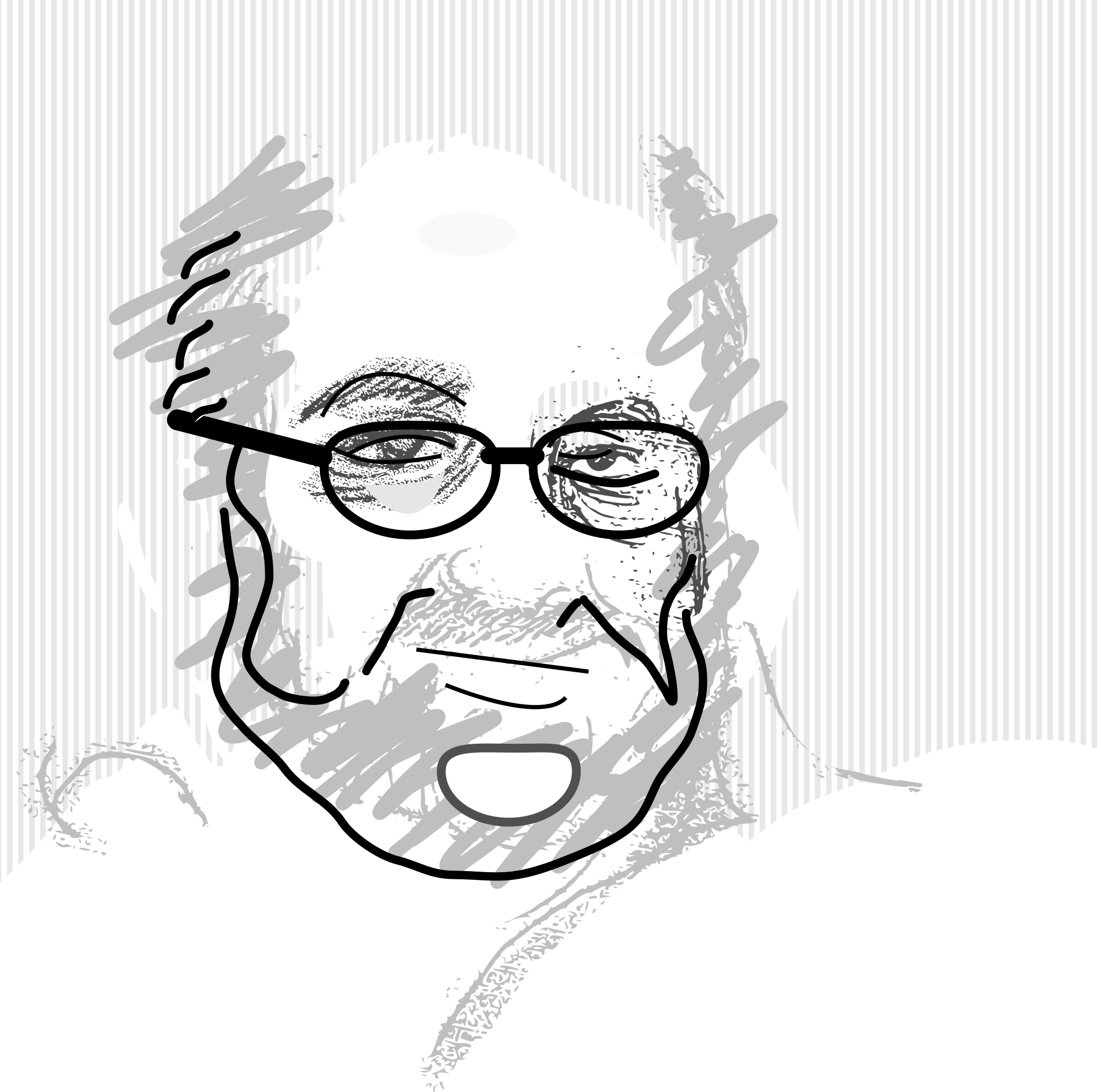 This is a black and white drawing of an older man wearing glasses. He has a mustache, and his eyes are closed as he smiles. The drawing captures the essence of the man's facial features, including his wrinkles and the lines around his mouth. The overall effect gives the impression that the image is a sketch or a black and white photograph.