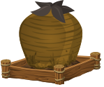 This features a brown wooden box with a large, round object inside of it. This object is shaped like an apple and has a stem on top. It appears to be made from wood and is placed in the center of the box. The box itself seems to be a decorative piece or possibly used for storage. The overall scene gives off a rustic vibe, with the wooden box and the unique apple-shaped object as its focal point.