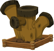 This features a wooden object with several holes in it, resembling a large pipe or a tree stump. It is placed on top of a wooden stand that has a basket-like structure underneath it. This unique piece of artwork appears to be made from wood and has an old-fashioned design. The combination of the wooden object and the wooden stand creates a visually appealing display, possibly for decorative purposes or as a functional item in a garden setting.