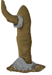 This features a large, odd-shaped tree trunk with a twisted and gnarled appearance. It has a thick brown bark that gives it an aged look. The trunk is positioned in the center of the scene, taking up most of the frame. There are several rocks scattered around the base of the tree, adding to its natural setting. Additionally, there is a small bird perched on one of the branches, giving life and movement to the otherwise still image.