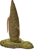 This features a large, odd-shaped object that appears to be made of clay or some other material. It is placed on top of a pile of dirt and has a hole in the middle. This unique structure resembles an animal, possibly a bird, with its head sticking out from the top. The overall appearance of this object gives it a somewhat creepy or strange look, making it stand out as an interesting piece of art or craftsmanship.