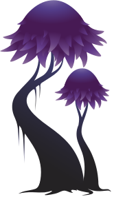 This features a unique and artistic scene of two purple flowers with long stems, resembling mushrooms or umbrellas. These flowers are positioned in the foreground, creating an interesting visual effect. In addition to the main flowers, there is another smaller flower located further back on the right side of the image. The overall composition of the scene gives a sense of depth and intrigue, as if the viewer has stepped into a fantastical world filled with these peculiar flora.