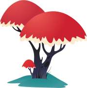 This features a tree with two red umbrellas on top of it, creating an interesting and whimsical scene. The umbrellas are positioned at different angles, adding depth to the composition. Above the tree, there is another smaller tree with a mushroom growing from its base, further enhancing the playful atmosphere. In addition to these elements, there are two more trees in the background, one on the left side and the other on the right side of the image. The overall scene appears to be set in an outdoor environment where nature meets creativity.