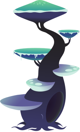 This features a unique and creative tree design, with multiple levels of branches and leaves. The tree is adorned with various mushroom-like structures on its branches, giving it an interesting and whimsical appearance. The tree's structure resembles a stack of plates or cups, adding to the visual appeal of the scene. Overall, this artistic representation of a tree showcases a blend of nature and imagination.