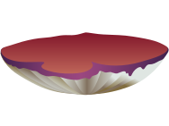 This features a red and purple cake with chocolate frosting, sitting on top of a white surface. The cake is shaped like a pie and has a hole in the middle. It appears to be an abstract or artistic representation of a dessert rather than a real-life food item. The colors used for the cake are predominantly red and purple, with some chocolate accents on the frosting.