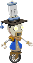 This features a robotic character wearing a graduation cap and gown, standing on top of a wheel. This unique design gives the impression that the robot is attending a graduation ceremony. The robot's outfit consists of a blue shirt and a scarf, adding to its academic appearance. The scene appears to be set in an open area with no other objects or people visible in the image.
