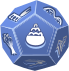 This features a blue and white die with various symbols on it. There are several hands drawn around the edges of the die, indicating that it is likely used for playing games or other activities involving dice. In addition to the hands, there are also images of buildings, a cake, and a knife on the die, adding more visual interest to its design. The combination of these elements creates an intriguing and unique appearance for this particular die.