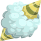 This features a birthday cake with a yellow and green frosting. It is adorned with a white cloud, giving it an interesting appearance. The cake appears to be made of cotton, adding a unique touch to its design. The overall presentation of the cake suggests that it could be used for a celebration or special occasion.