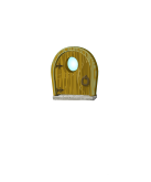 This features a small, cute wooden door with a blue window. It is situated on a white background, which makes the door stand out prominently. The door appears to be part of an animated scene or possibly a fantasy setting, as it has a whimsical and imaginative appearance. The blue window adds a touch of color to the otherwise monochromatic image, creating visual interest and depth.