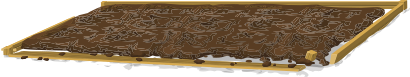 This features a brown and tan colored rug with an intricate design. It is placed on top of a wooden table, which appears to be the main focus of the scene. The rug has a patterned surface that adds visual interest to the overall composition. The wooden table beneath the rug provides a contrasting texture and color, creating a harmonious balance between the two elements in the image.