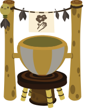 This features a wooden bowl with a handle, placed on top of a wooden stand. The bowl is filled with some liquid and has a sign hanging above it. The scene appears to be set in an Asian-inspired environment, as there are several decorative elements present. There are two bamboo poles on either side of the bowl, adding to the overall aesthetic. Additionally, there is a bird figure and a leaf design visible in the background, further enhancing the cultural atmosphere.