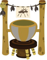 This features a wooden bowl with a handle, placed on top of a wooden stand. The bowl is filled with water and has a cloudy appearance, giving it an artistic look. Above the bowl, there are two signs hanging from ropes, adding to the overall decoration of the scene. Additionally, there are leaves surrounding the area, further enhancing the visual appeal of the setting. The combination of these elements creates a unique and visually interesting display.