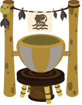 This features a wooden bowl with a lid, placed on top of a wooden stand. The bowl is adorned with a decorative design and has a sign hanging above it. The scene also includes a few leaves scattered around the area, adding to the overall ambiance. The wooden stand appears to be part of an outdoor setting or possibly a cultural display, as there are several other items in the vicinity. These include a vase, a cup, and a bottle, all placed at various distances from the bowl on the stand.