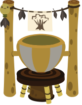 This features a wooden bowl with a handle, placed on top of a wooden stand. The bowl is filled with water and has a tree design on it. Above the bowl, there are two bamboo poles holding up a tapestry or flag. Additionally, there are leaves hanging from the poles, adding to the overall decoration of the scene.