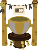 This features a wooden table with a large bowl on top of it. The bowl is filled with water and has a small frog sitting inside, adding an element of whimsy to the scene. Above the table, there are two poles holding up a string of leaves, creating a decorative backdrop for the table setting. Additionally, there is a clock hanging on the wall above the table, providing a sense of time and space in the image.