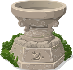 This features a large, ornate stone bowl or vase with intricate carvings on its surface. It is placed in the middle of a garden setting and surrounded by greenery. There are several plants surrounding the bowl, including some near the top left corner, others at the bottom right corner, and one plant located towards the center-left side of the image. The overall scene gives off an impression of a peaceful and serene environment.