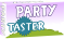 This features a purple background with white text that reads "Party Taster." Above the text, there is an illustration of a green and blue pinwheel. This design gives the impression of a fun and festive atmosphere associated with the product being advertised.