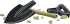 This features a collection of tools, including a shovel and a spade. These tools are arranged in an artistic manner, with the shovel placed on top of the spade. There is also a wrench present in the scene, adding to the variety of tools displayed. The arrangement of these items creates a visually appealing composition that showcases their different shapes and sizes.