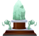 This features a statue of a green rock, which is placed on top of a brown pedestal. This unique sculpture appears to be made from marble and has an intricate design. In addition to the main statue, there are two smaller figures positioned at the base of the pedestal, each holding a pickaxe in their hands. These figures seem to be part of the overall composition, adding depth and interest to the scene. The combination of the large green rock, the brown pedestal, and the smaller figures creates an artistic and visually appealing display.