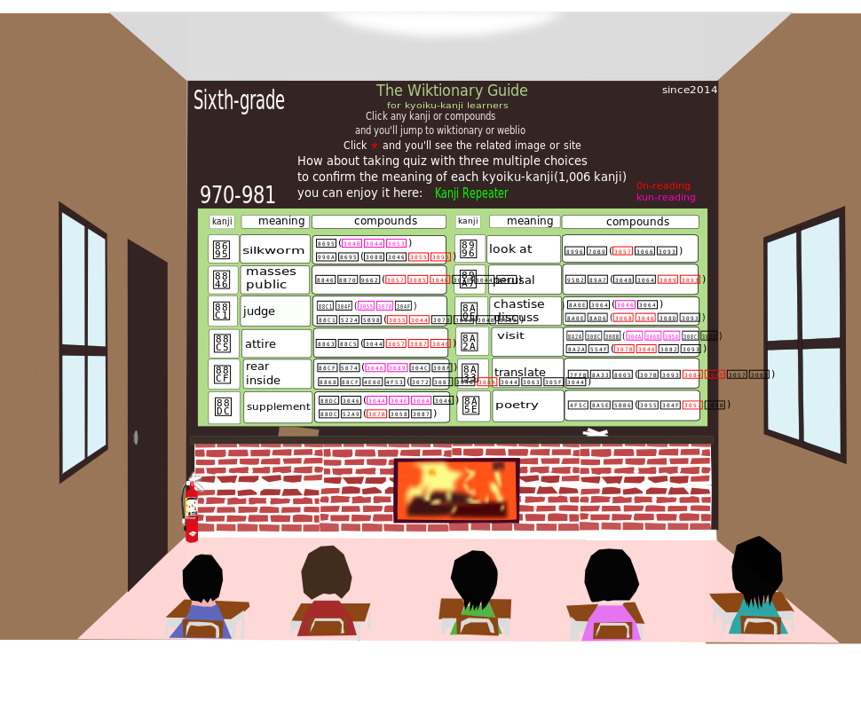 This depicts a classroom setting with several children sitting in their desks, attentively looking at the blackboard. The board is filled with kanji and their translations, providing an educational experience for the students. There are multiple chairs placed around the room, some of which are occupied by the children. A fireplace can be seen in the background, adding a cozy atmosphere to the classroom. Overall, it appears to be a well-organized learning environment where students can engage with their studies and develop their language skills.