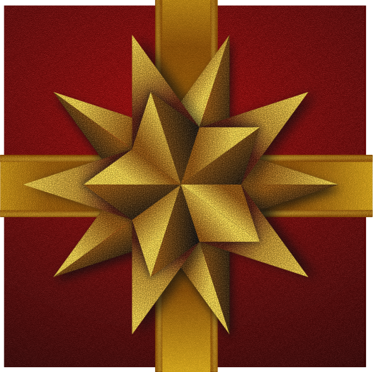 This features a red background with a large, golden star-shaped bow placed on top of it. The bow is adorned with gold and yellow colors, giving it an eye-catching appearance. The star shape adds a unique touch to the overall presentation, making it stand out against the red backdrop. This could be used as a decoration or gift wrapping for various occasions, such as Christmas or birthdays.