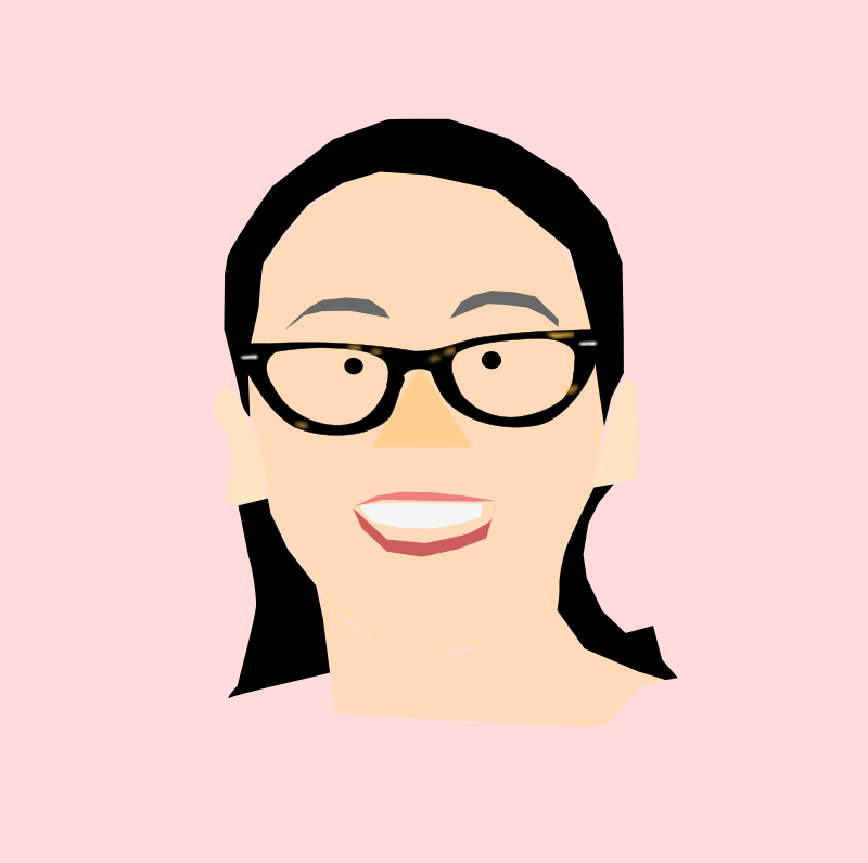 This features a woman wearing glasses and smiling. She has dark hair, which is styled in a bun. Her smile appears genuine as she poses for the camera. The woman's head takes up most of the frame, with her face being the main focus of the picture.