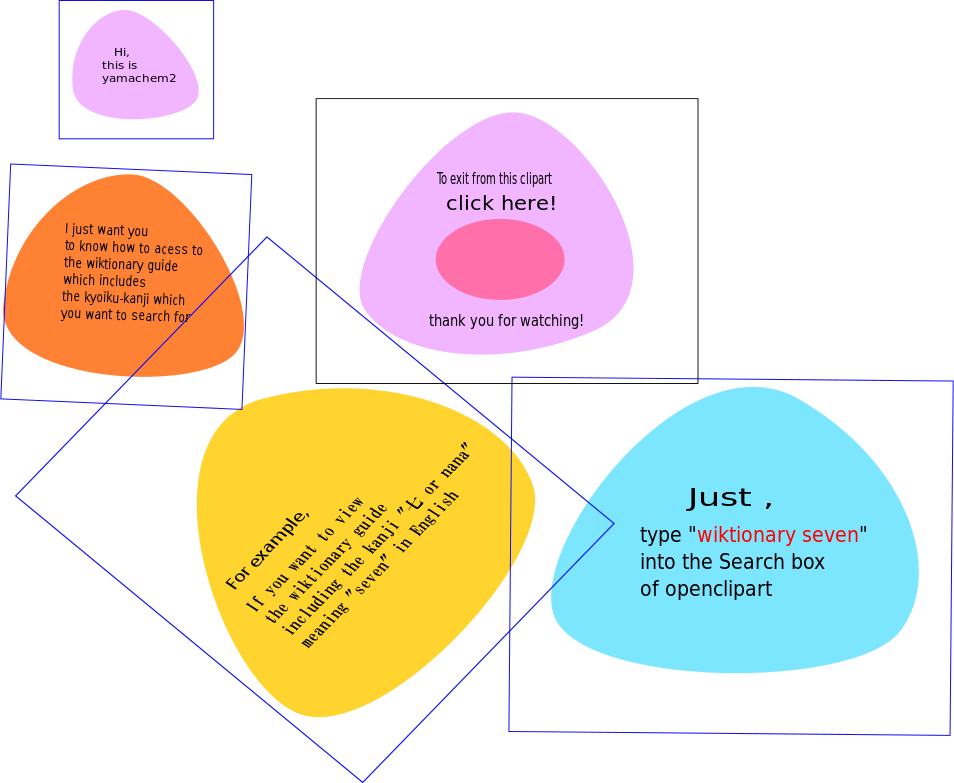 This consists of four circles, each containing a different message. One circle is yellow and has text that says "I want wiktionary -guide users to know how to access the clipart called as 'wiktionary guide' including the kyoiku-kanji which you want to search for." Another circle is orange and contains text about the Japan Foundation, a website where one can learn Japanese for free. The third circle is pink and has a message that says "You can see the contents in various languages." Finally, the fourth circle is blue and has text that reads "The 'JAPAN FOUNDATION' URL is here: [www.erin.ne.jp/en/"](http://www.erin.ne.jp/en/)." The circles are arranged in a square formation with each circle occupying one of the four corners.