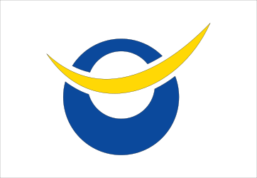 This features a blue and yellow circle with a crescent moon inside of it. This design is reminiscent of the flag for Fukushima, Japan. The colors used in this logo are predominantly blue and yellow, creating an eye-catching visual effect. The combination of these two colors gives the impression of a sun rising over the horizon, which adds to the overall appeal of the design.