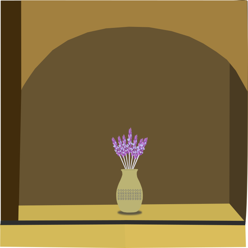 This features a vase filled with purple flowers, placed on a table in front of a wall. The vase is positioned towards the center of the scene and appears to be the main focus of the image. The wall behind the vase has an archway that adds depth and interest to the composition. This setting could be reminiscent of a Japanese style reception room, where flower arrangements or hanging scrolls are typically displayed in built-in recessed spaces called "tokonoma."
