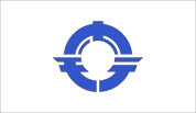 This features a blue and white circle with an airplane inside of it. This design is likely associated with the Omotego, Fukushima region. The circle has a distinctive shape, making it easily recognizable as part of this particular location's flag or symbol.