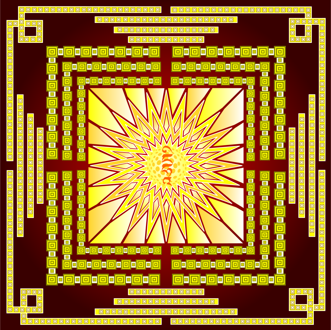 This features a large, intricate design with a central sun motif. The sun is surrounded by a circle of golden decorations and has a yellow background that contrasts beautifully with the surrounding pattern. This artistic piece appears to be an ornate mandala, which is often used in spiritual practices or as a decorative element. The intricate patterns and vibrant colors create a visually striking scene that captures attention and invites contemplation.