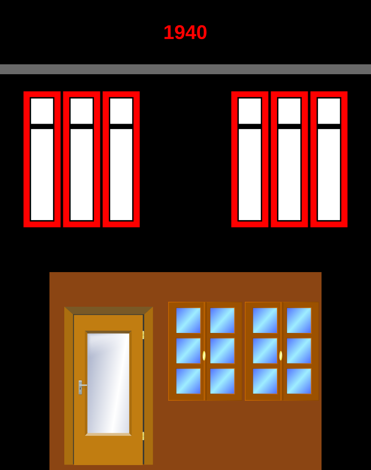 This features a black and white drawing of an old building with a brown door. The door is situated in the center of the scene, surrounded by windows on all sides. There are four windows on each side of the door, giving the impression that it's located at the corner of a street. The overall design of the building gives off a vintage and nostalgic feel, reminiscent of an early 1940s minimalist art deco two-storey structure.
