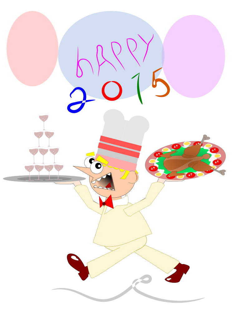 This features a cheerful cartoon chef holding a plate of food, likely pizza, and appears to be running with it. He is wearing a red bow tie and has a big smile on his face, indicating that he is happy. The scene takes place in front of a dining table filled with various wine glasses, suggesting a celebration or gathering. The chef's enthusiasm and the presence of wine glasses create an atmosphere of joy and festivity.