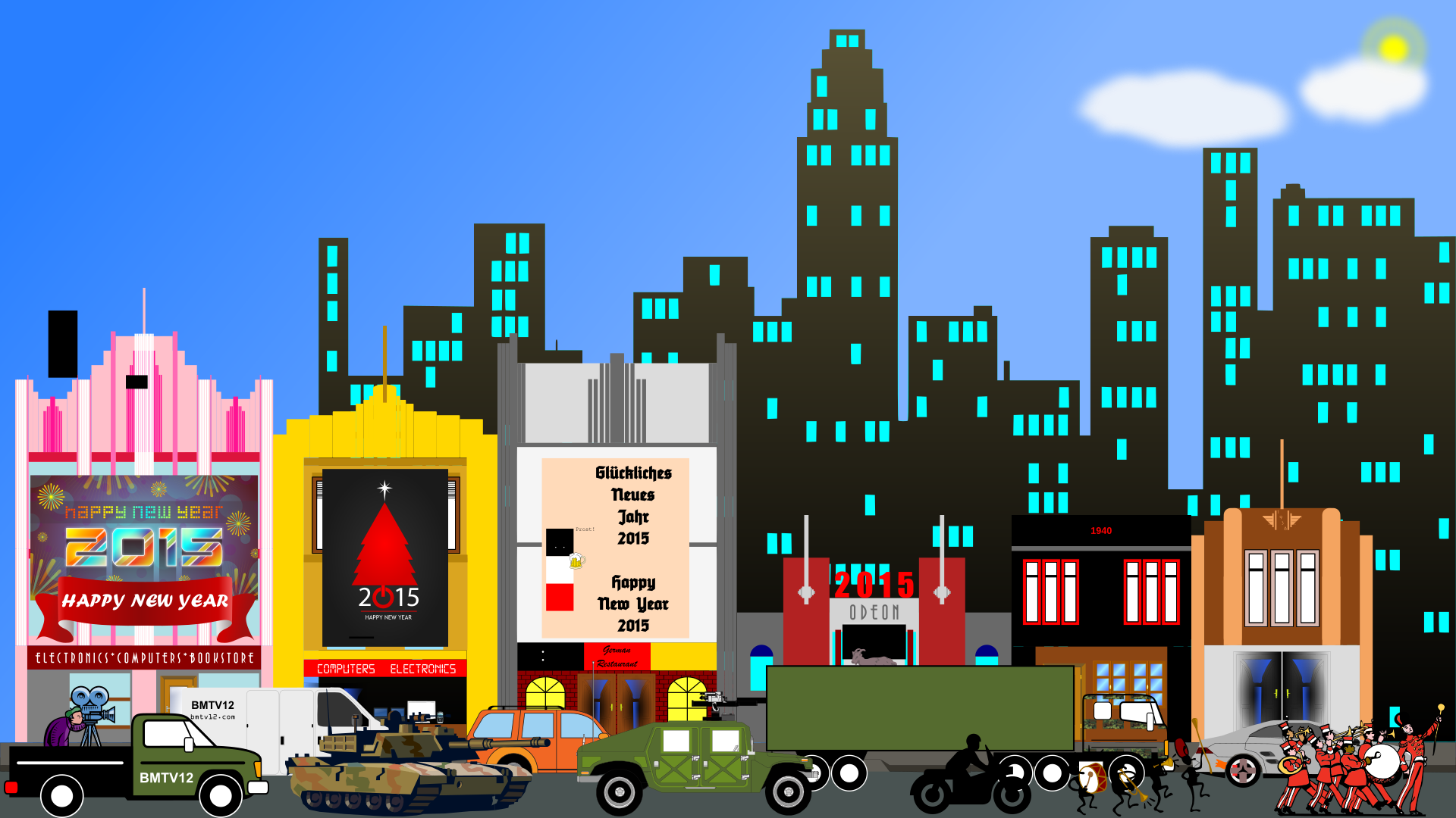 Tags: 2015, art deco, band, city, holiday, military, new year, parade, tanks, cartoon, car, truck, billboard, skyline