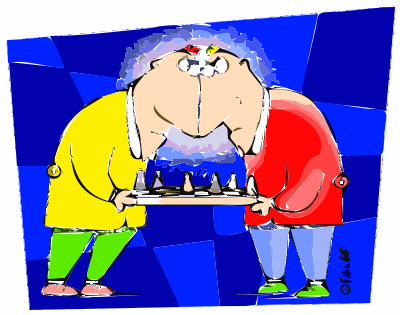 This features two men standing next to each other, both holding chess boards. They are positioned in a way that their heads appear to be touching or almost kissing as they play the game together. One of the men is wearing a yellow shirt while the other has on a red shirt. The scene takes place against a blue background, which adds a vibrant and lively atmosphere to the image.