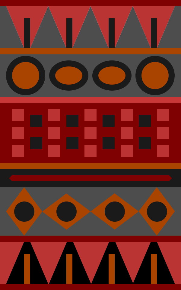This is a colorful and intricate design featuring various geometric shapes. These shapes include triangles, squares, and other patterns that are arranged in an eye-catching manner. The colors used for the design are predominantly red, with some orange and brown accents. The overall effect of this artwork is visually striking and captivating, showcasing a unique blend of geometric shapes and vibrant hues.