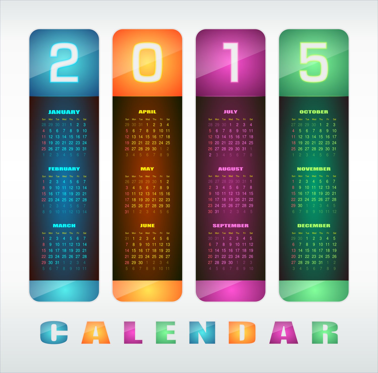 This features a colorful calendar that is divided into four sections, each containing three months. Each section has a different colored background and the months are displayed in a visually appealing manner. The calendar spans from January to December, providing a comprehensive view of the year 2015. The vibrant colors and design make it an attractive and functional tool for keeping track of dates throughout the year.