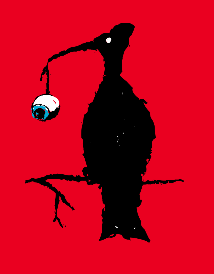 This features a black bird with an eye in its mouth, standing on a branch. It appears to be a crow or a similar species of bird. The bird is the main focus of the scene and takes up most of the frame. The red background adds a striking contrast to the black bird, making it stand out even more.