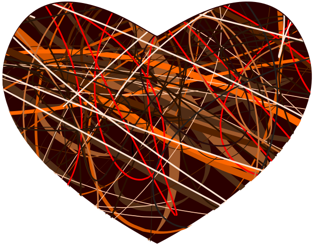 This features a heart-shaped design made up of various lines and squiggles. These lines are intertwined, creating an interesting pattern that resembles the shape of a heart. The colors used in this design include red, brown, and orange, giving it a warm and inviting appearance. This unique heart design could be used for various purposes such as decoration or even as a symbol on clothing items or accessories.