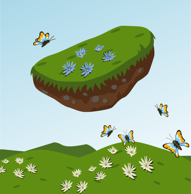 This features a floating island in the sky, surrounded by a field of flowers. There are several butterflies flying around the island, with five multicolored ones visible in various positions. The floating land is adorned with fifteen white flowers, which are scattered across its surface. These flowers come in different shades and sizes, adding to the overall beauty of the scene. Overall, it's a whimsical and delightful image that captures the essence of nature and imagination.