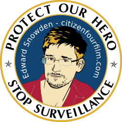 This features a circular button with the words "Protect our hero," "Stop surveillance," and "Edward Snowden - citizenfourfilm.com" written on it. Above these words, there is an illustration of Edward Snowden's face in a style reminiscent of an NSA emblem. The button serves as a symbol for the protection of privacy rights and the fight against surveillance.