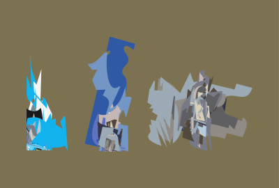 This features a collage of three different pictures, each with a unique perspective. In the first picture, there is a blue and white scene that appears to be a painting or drawing. The second picture showcases an artistic representation of a person standing in front of a building. This individual seems to be wearing a hat, adding a touch of character to the image. Finally, the third picture features a close-up view of a person's face, possibly a portrait or a still from a movie. The combination of these three images creates an interesting and diverse visual experience for the viewer.