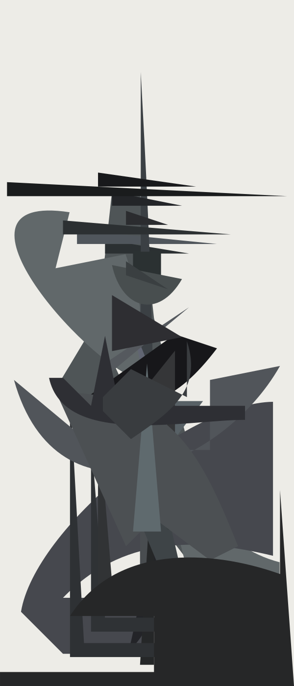 This is a black and white picture of an abstract sculpture. It appears to be a remix or a remastered version of the original artwork, giving it a unique and intriguing appearance. The sculpture features a person holding a large object in their hands, possibly a piece of equipment or a tool. The overall composition of the image is visually striking, with the contrast between light and shadow adding depth to the scene.