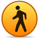 This features a yellow circle with an orange outline, which is a walking person icon. This icon is commonly used to represent the act of walking or moving in various contexts such as navigation systems, websites, and mobile apps. The walking person symbol appears to be the main focus of the image, occupying most of the frame.