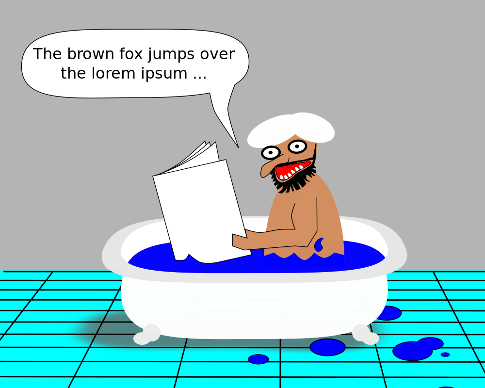 This features a man sitting in a bathtub filled with blue water. He is reading a newspaper, and there's a chat bubble above his head that says "The brown fox jumps over the lorem ipsum." This humorous scene creates an amusing juxtaposition between the man's relaxing bath time and the reference to a famous Latin phrase. The image also includes a book placed near the tub, adding to the overall atmosphere of leisure and relaxation.